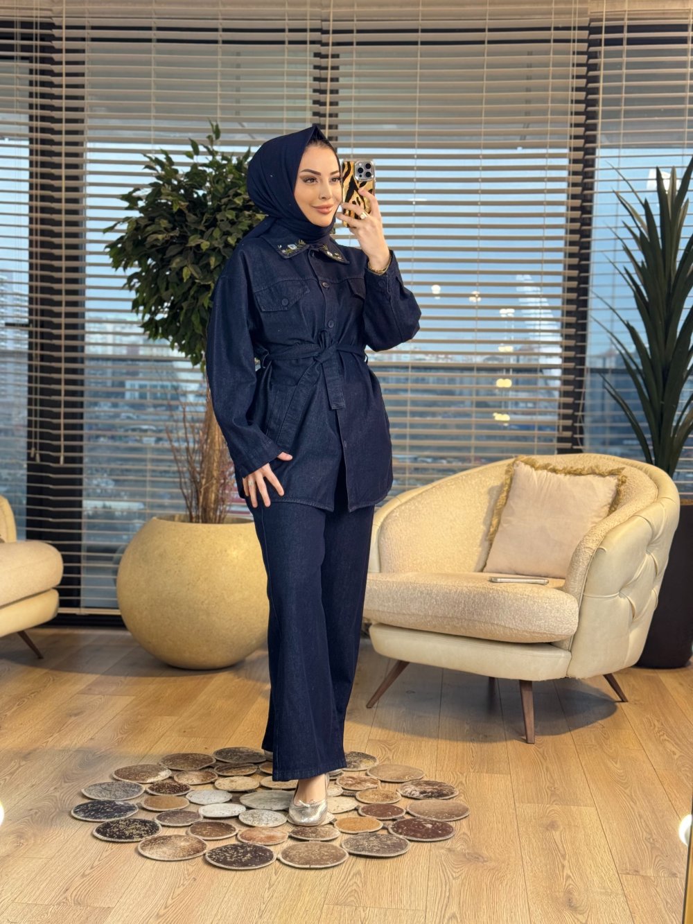 7445 Kot Ön Cepli Yakası Çiçek Nakışlı Takım Mavi