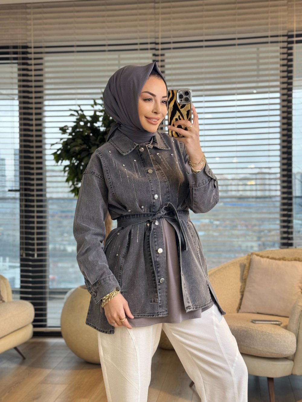 7456 Kot Ön Sıra Taş Baskılı Ceket Gri