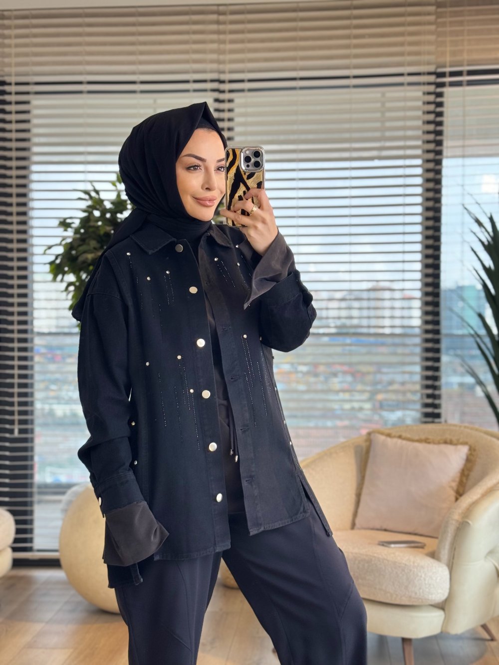 7456 Kot Ön Sıra Taş Baskılı Ceket Siyah