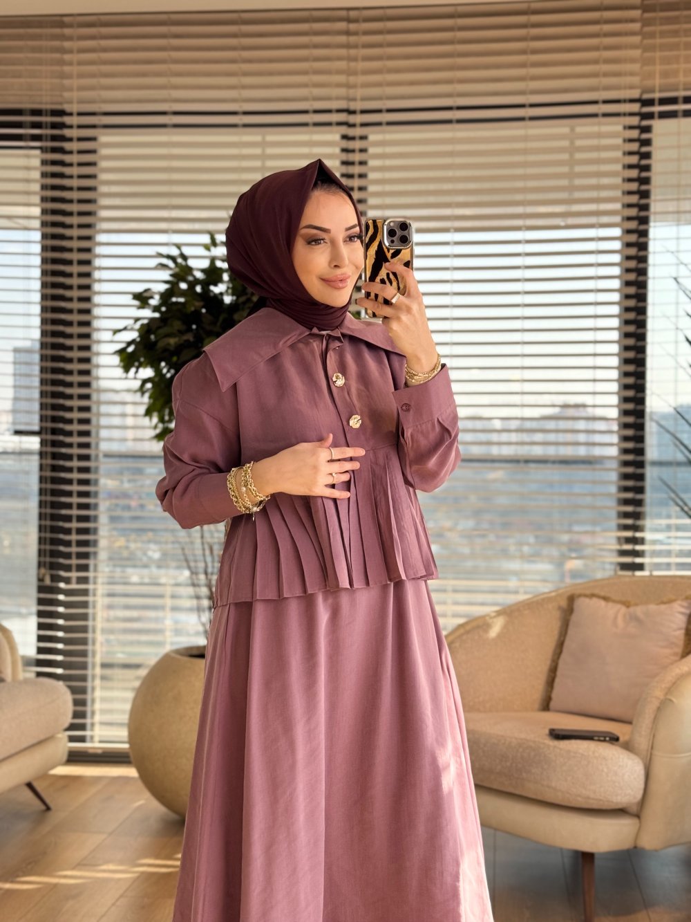 7457 Pileli Gold Düğmeli Etekli Takım Mürdüm