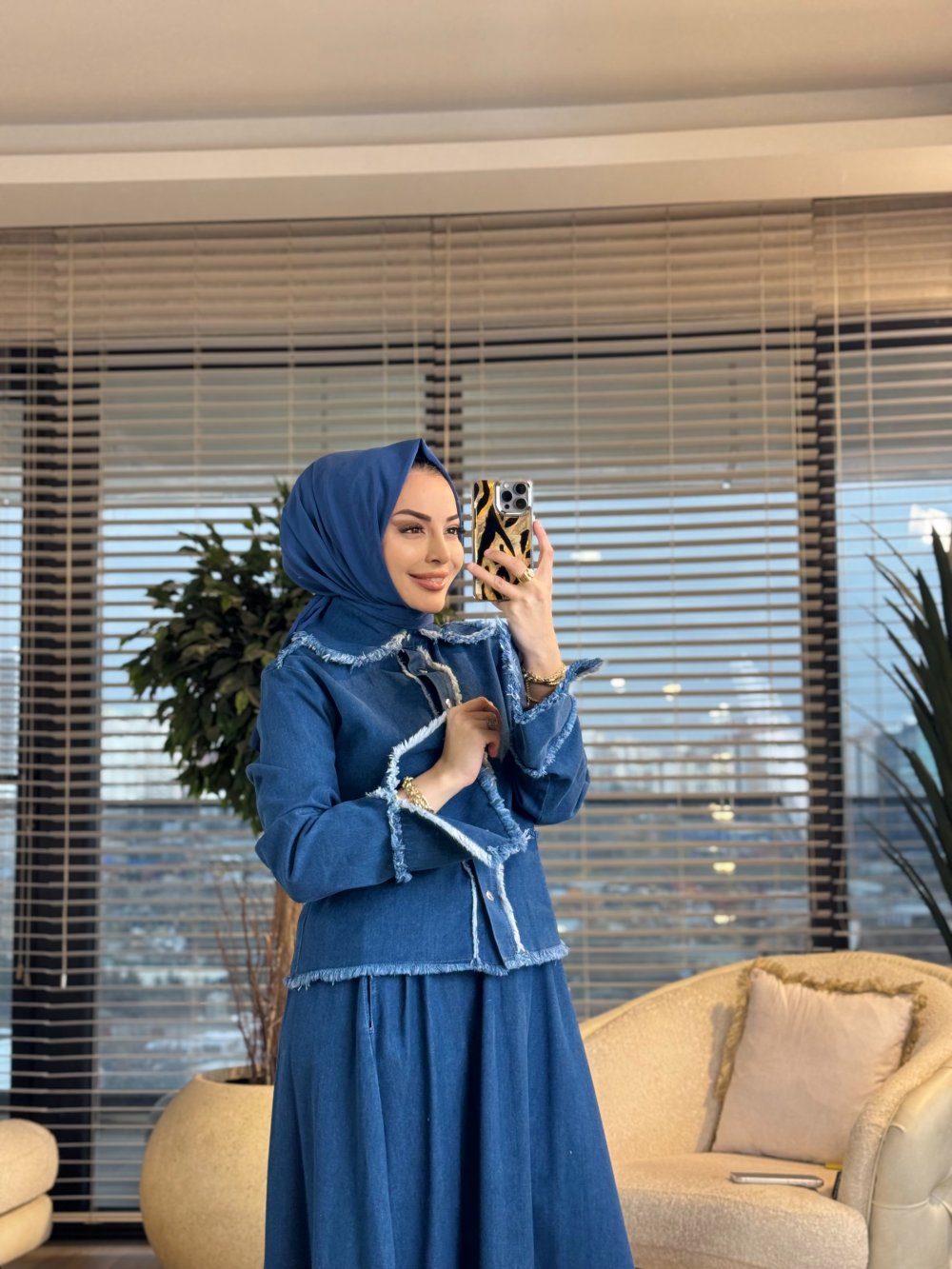 7475 Tencel Saçak Detaylı Etekli Takım Mavi