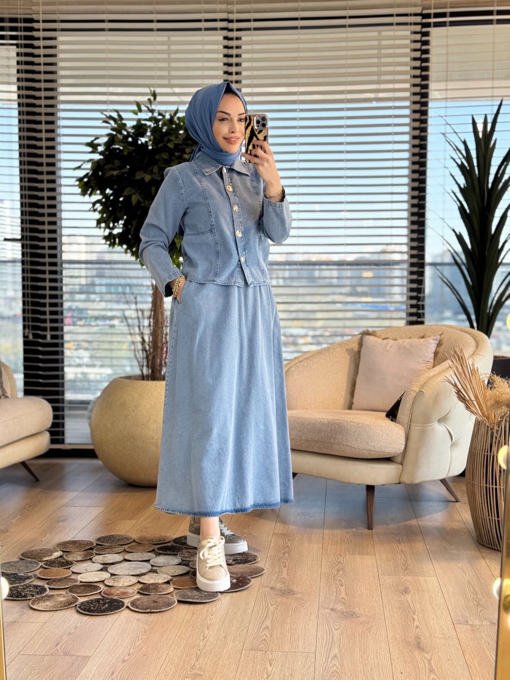 7478 Önü Gold Düğmeli Etekli Kot Takım Mavi