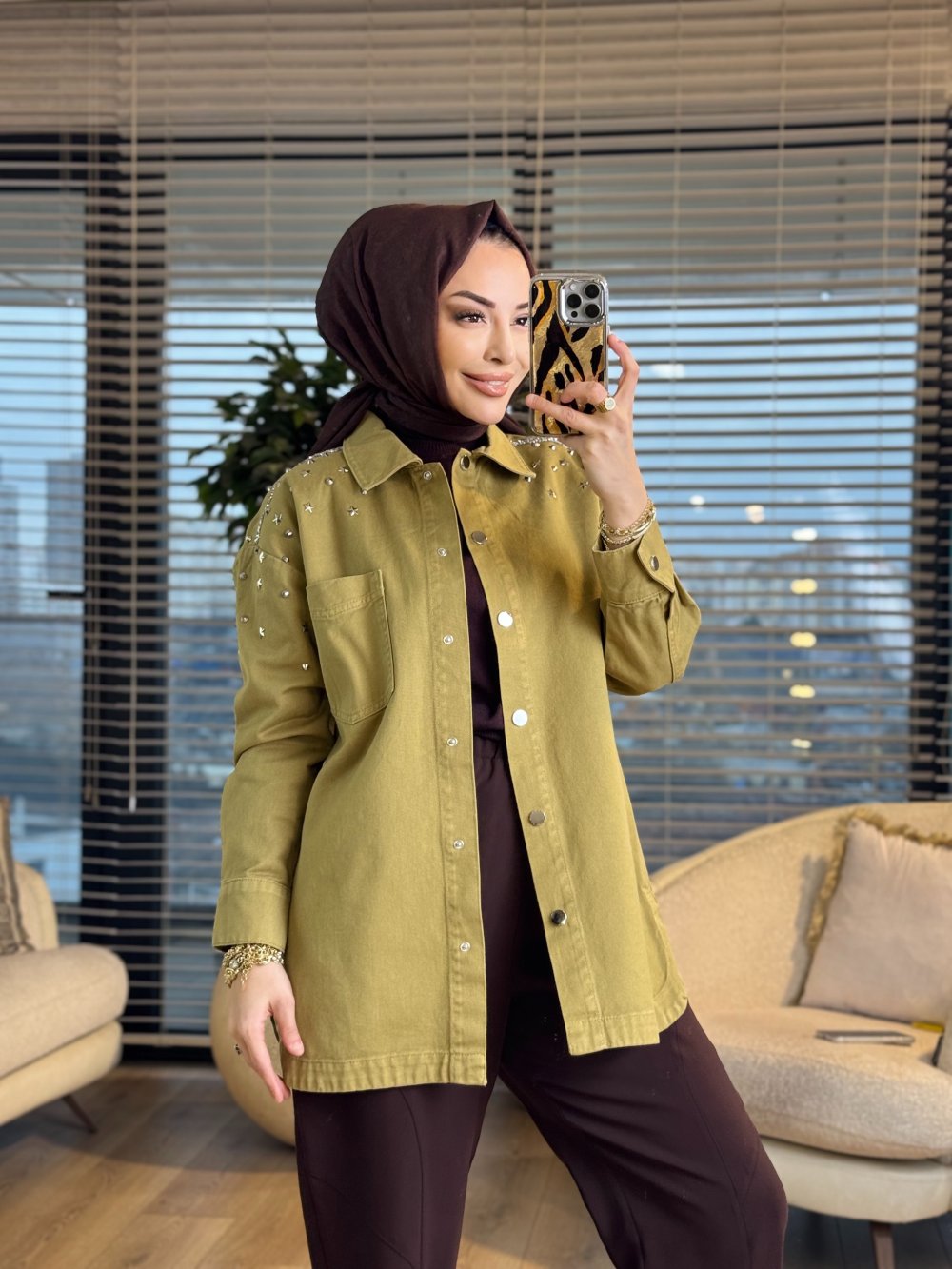 7486 Omuz Zımba Yıldız Detaylı Kot Ceket Yağ Yeşili
