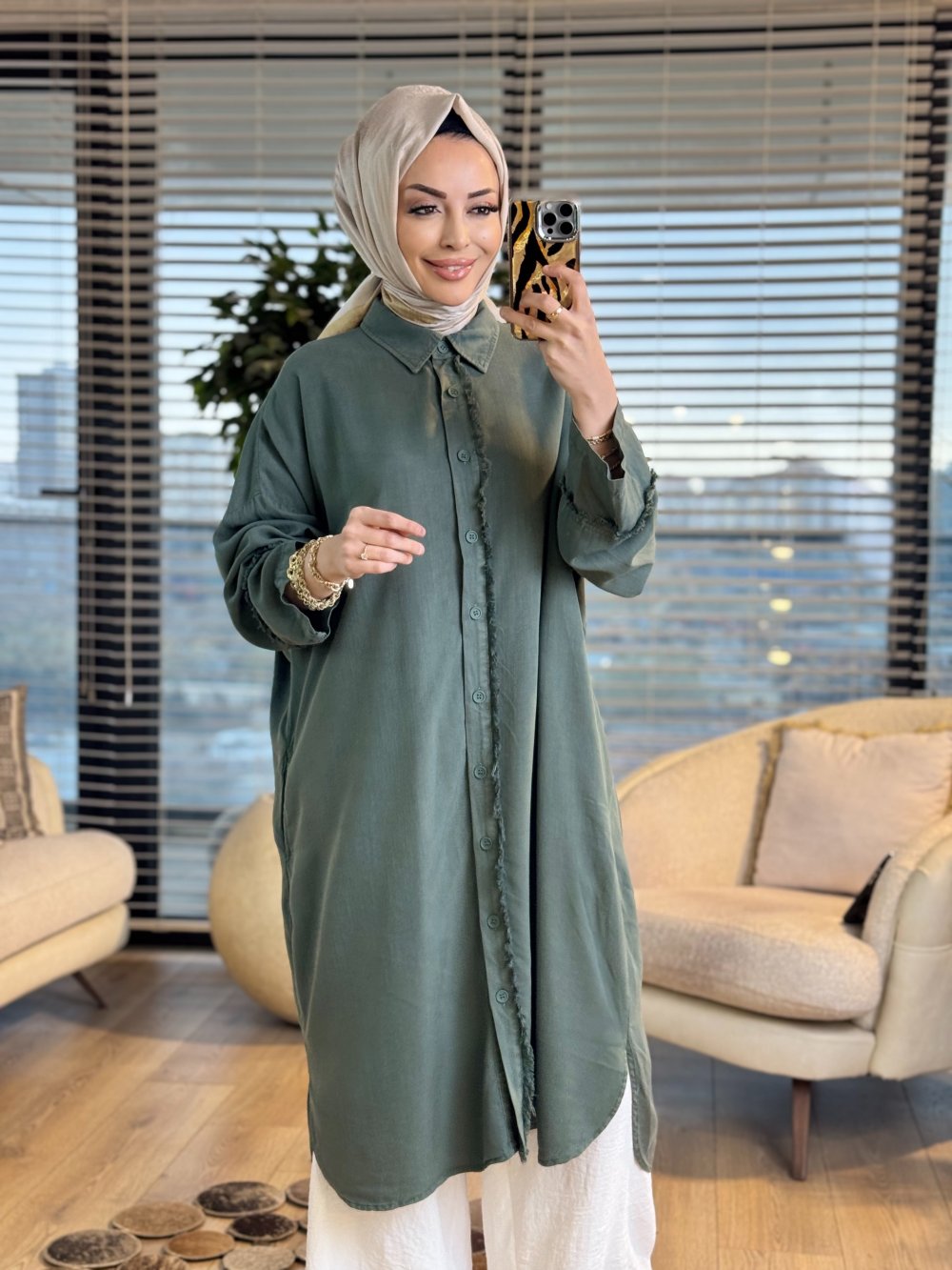 7495 Tencel Patı Ve Kolu Saçak Detaylı Uzun Tunik Haki