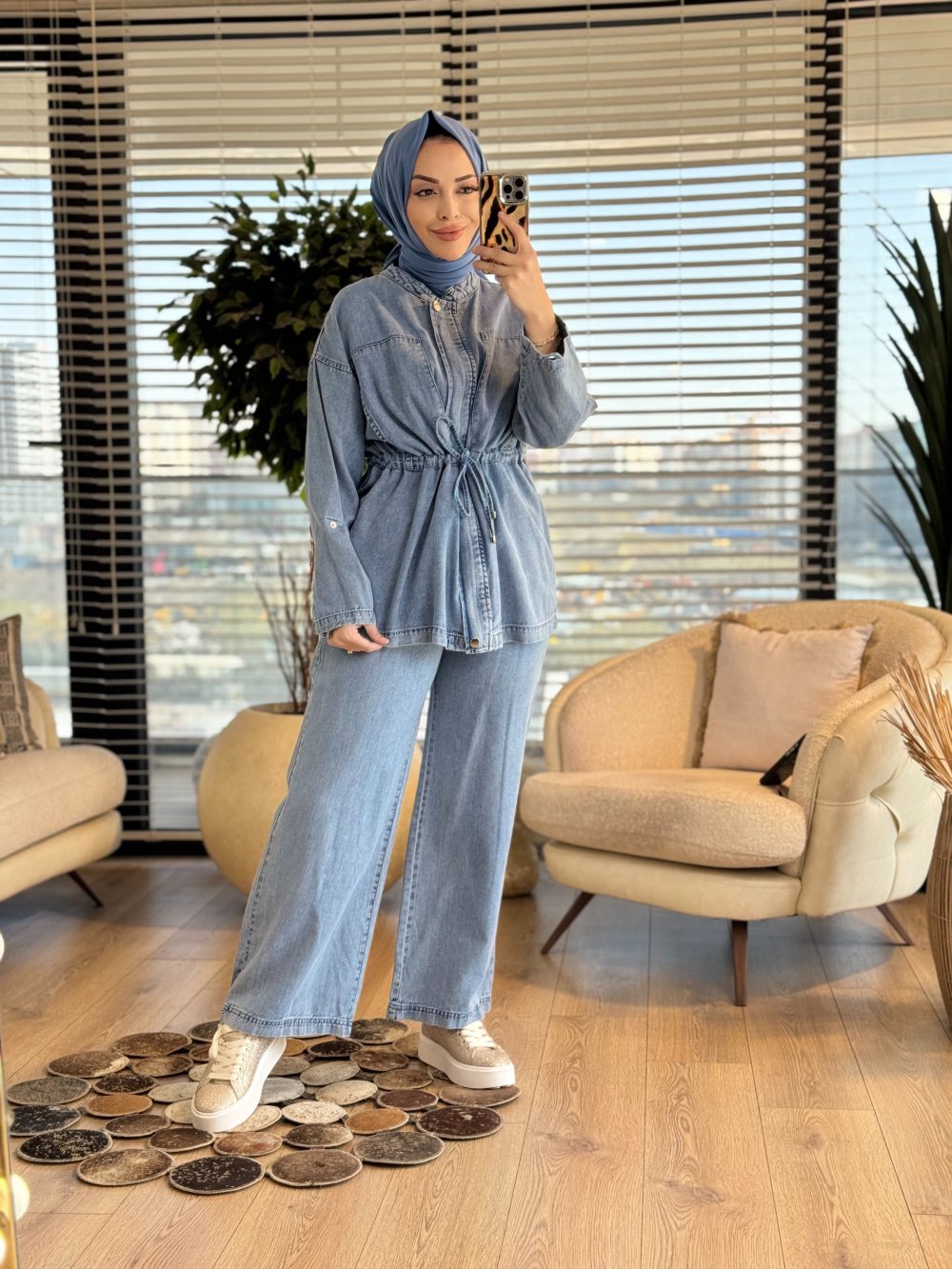 7498 Kot Ön Parça Dikiş Detay Bağcıklı Takım Açık Mavi