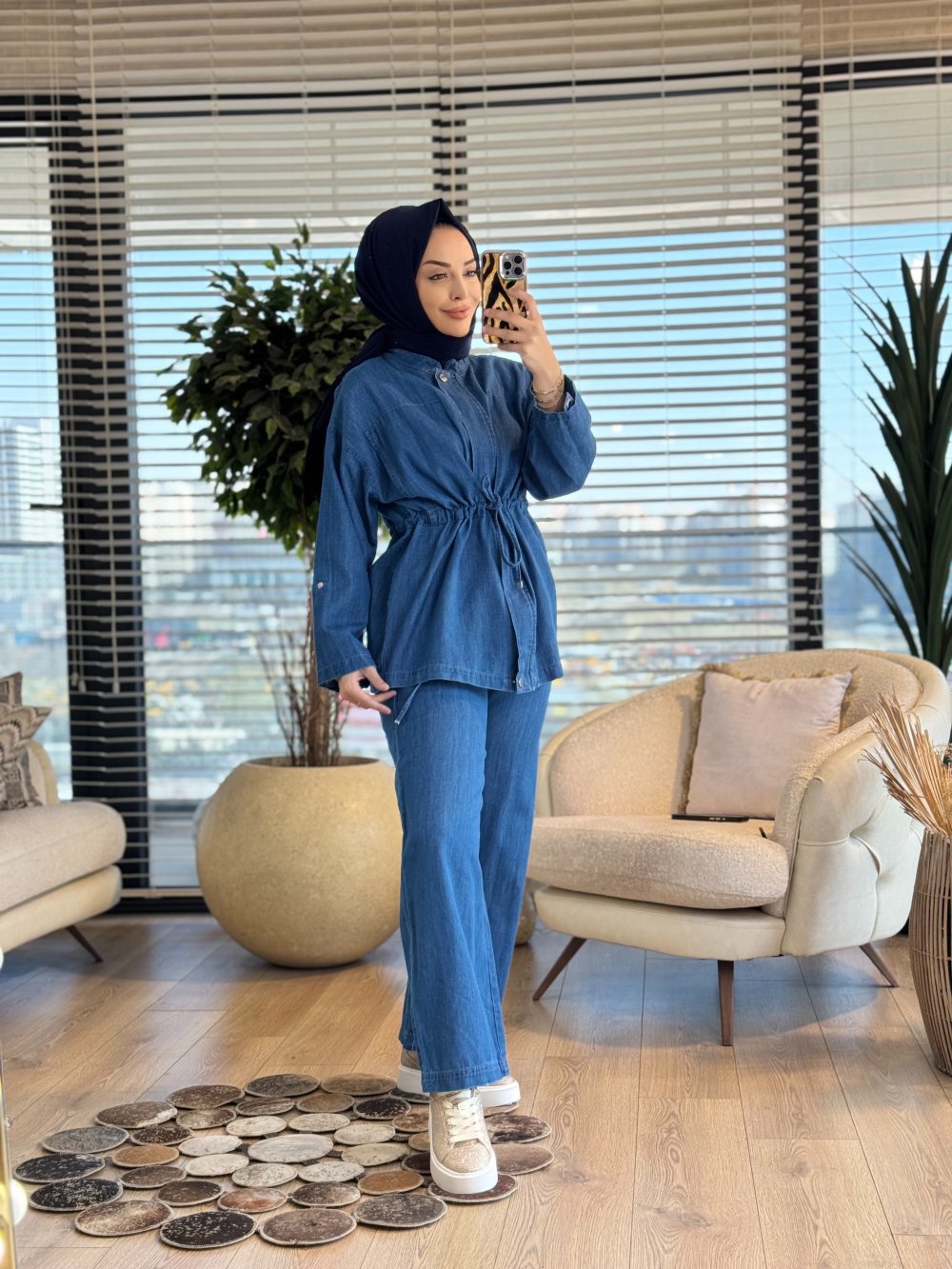 7498 Kot Ön Parça Dikiş Detay Bağcıklı Takım Mavi