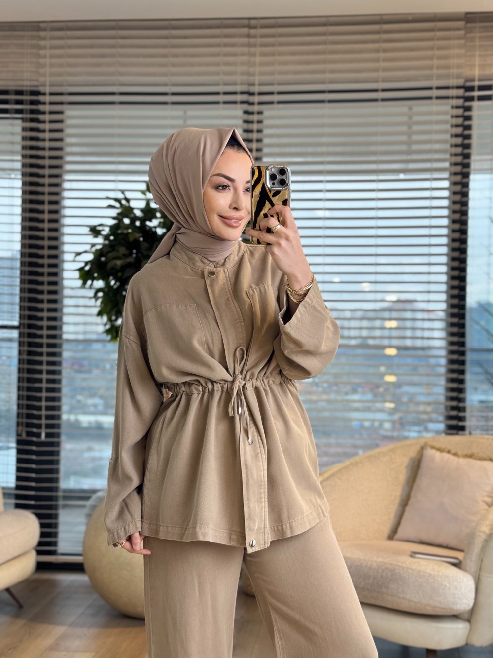 7498 Kot Ön Parça Dikiş Detay Bağcıklı Takım Vizon