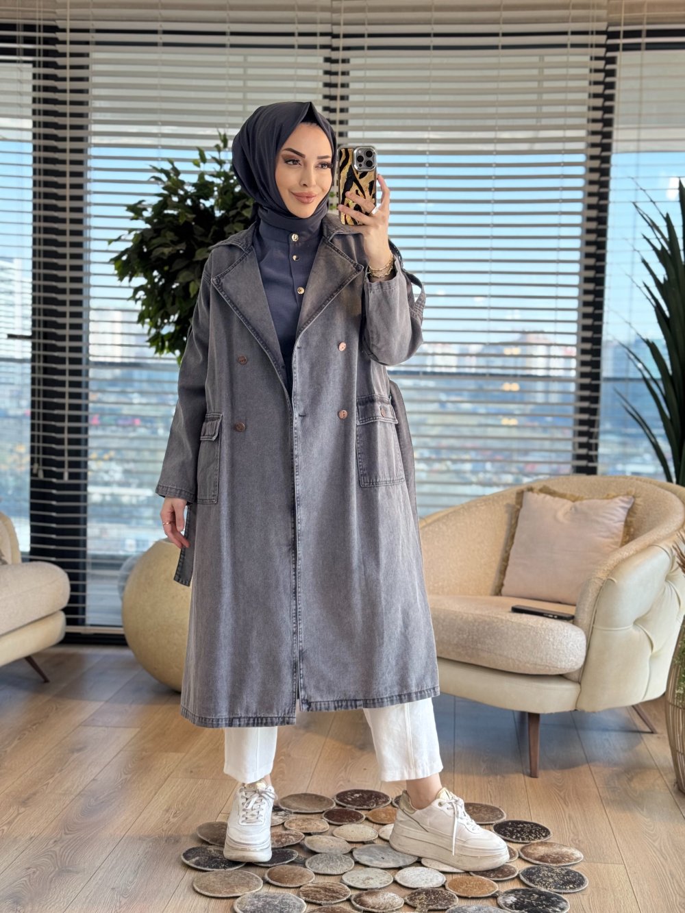 7503 Altı Düğmeli Apoletli Kot Trenç Gri