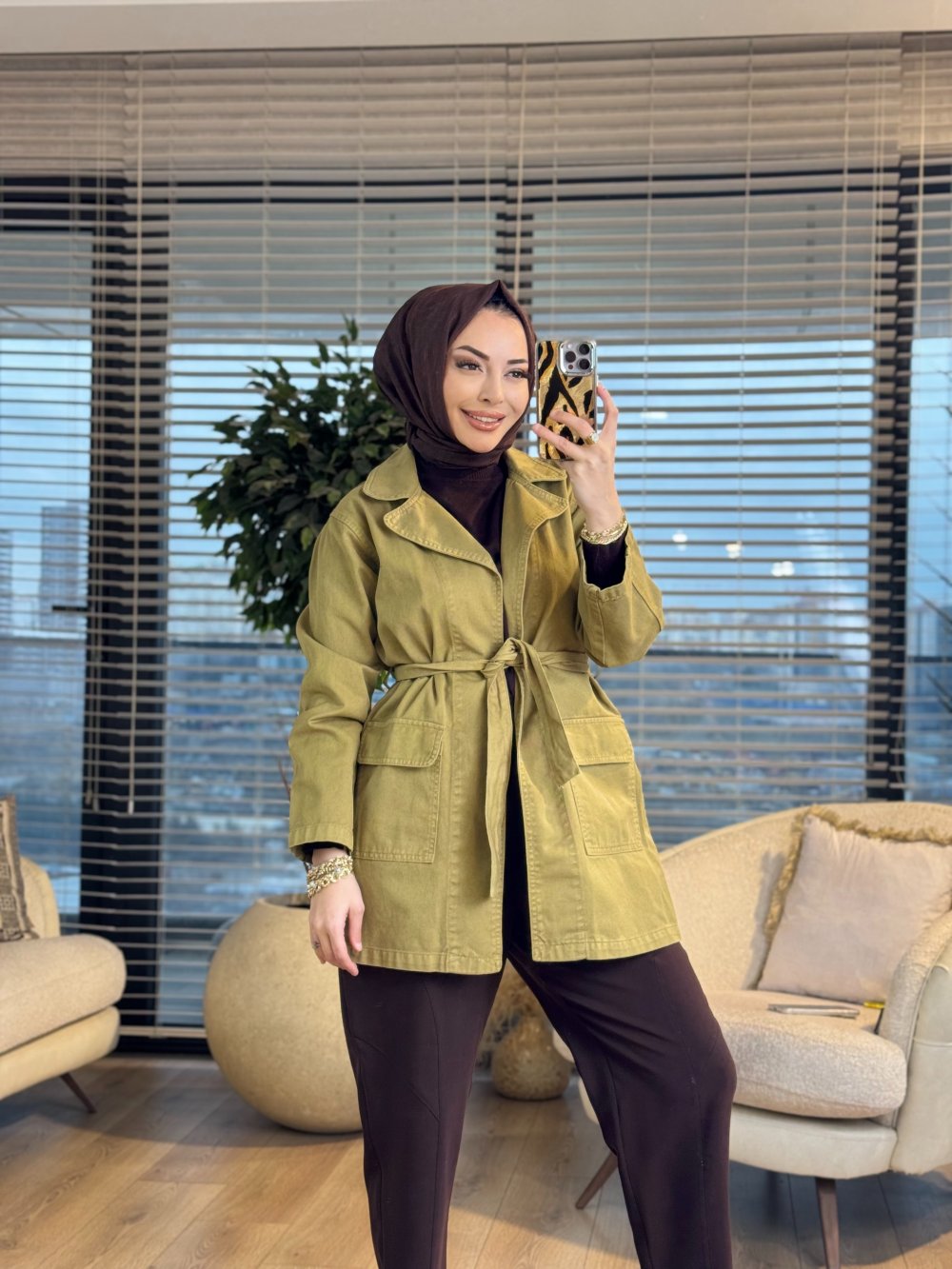 7507 Şal Dügmesiz Kot Trenç Koyu Yağ Yeşili