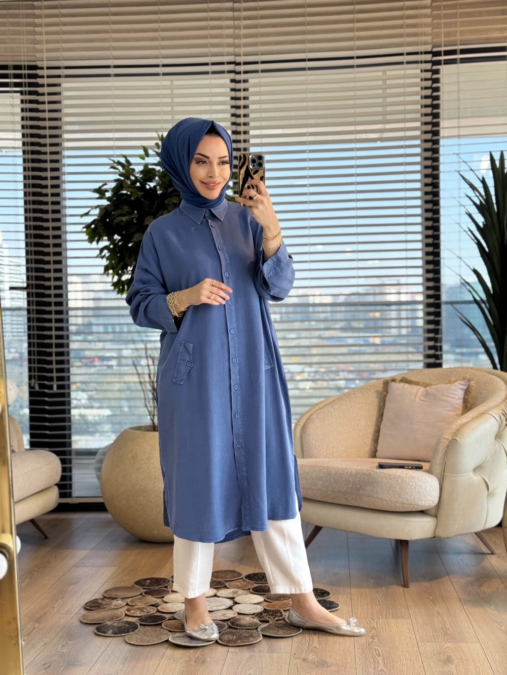 7509 Tencel Ön Düğmeli Cep Kapaklı Uzun Tunik