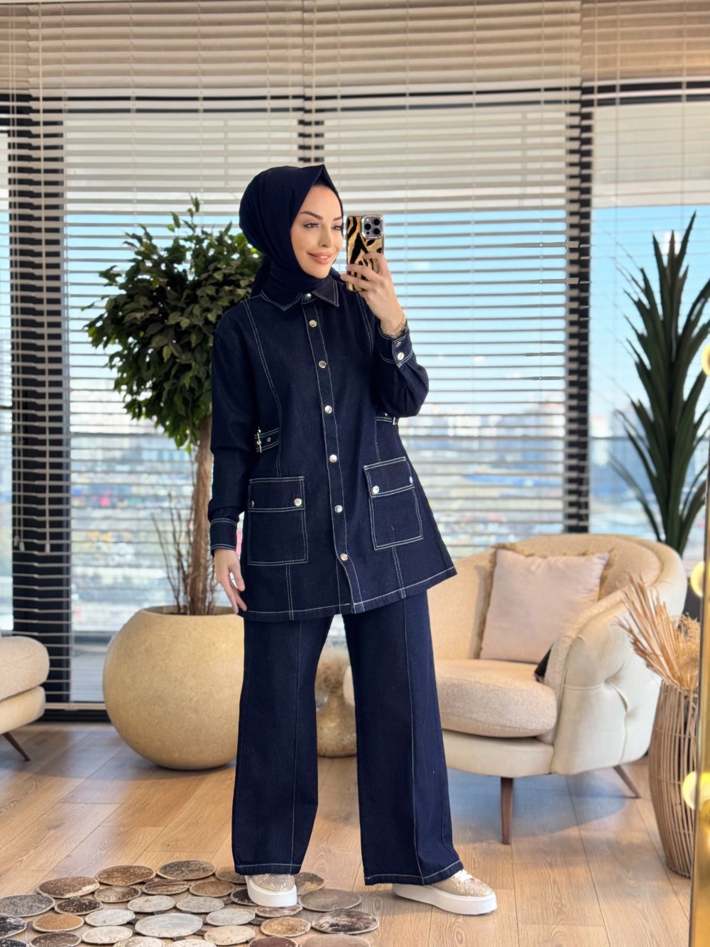 7512 Önü Tokalı Ve Cepli Kot Takım Koyu Lacivert