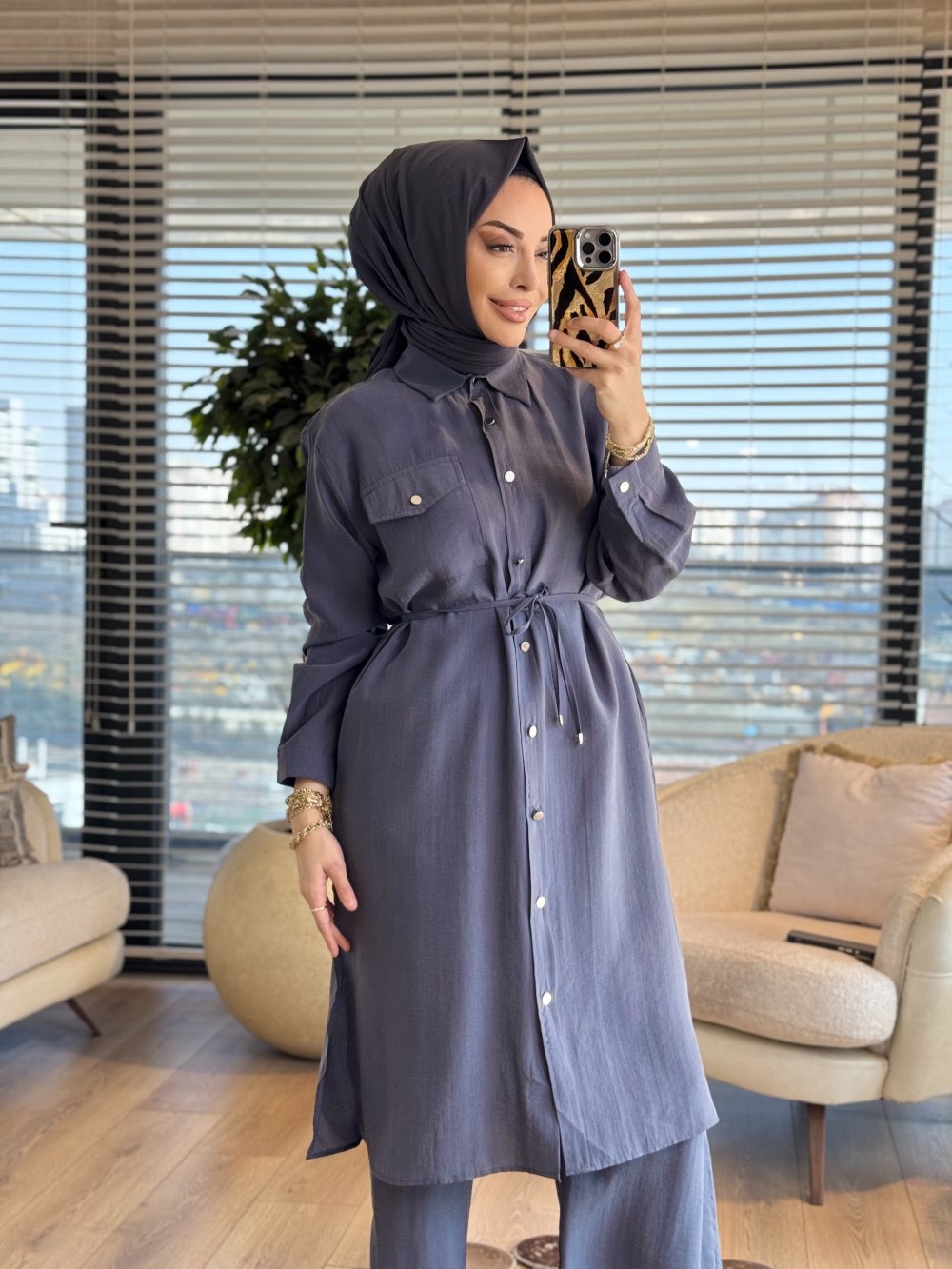 7513 Uzun Tunik Tek Cepli Takım Gri