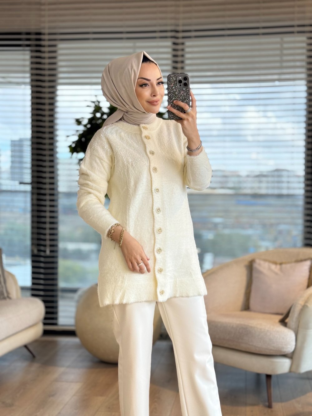 7701 Angora Boncuklu Oversize Hırka Ekru