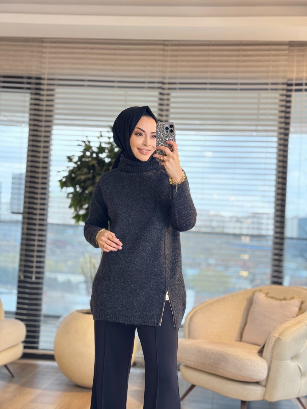7768 Oslo Yandan Fermuarlı Triko Tunik Antrasit