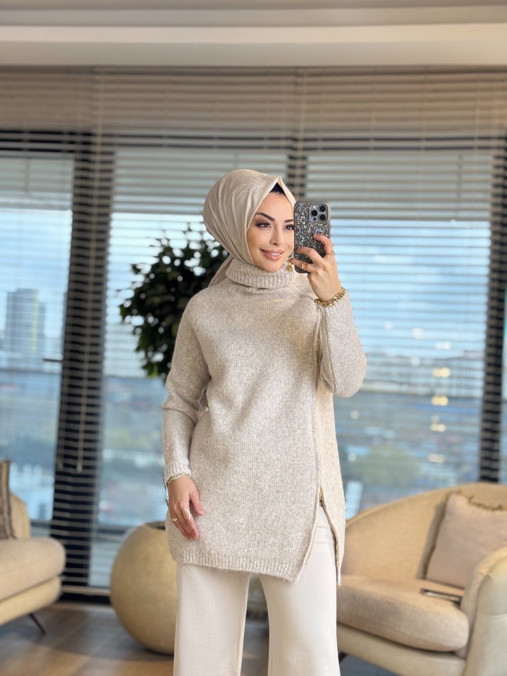 7768 Oslo Yandan Fermuarlı Triko Tunik Bej
