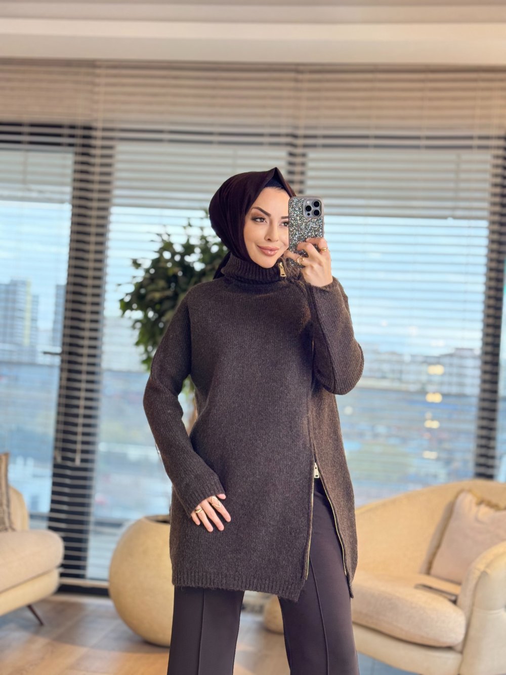 7768 Oslo Yandan Fermuarlı Triko Tunik Kahve