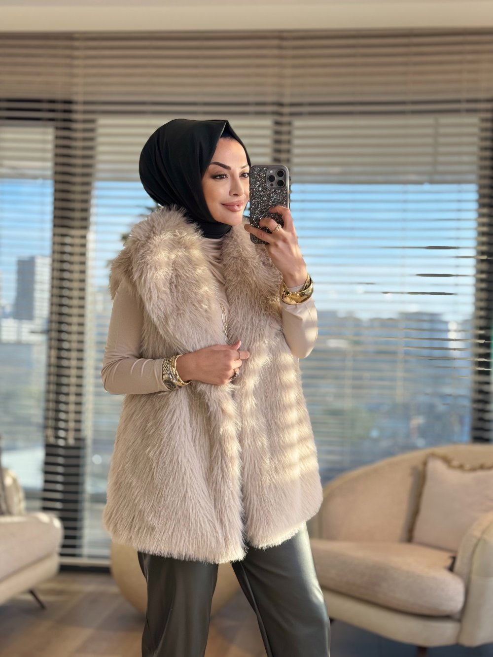 7921 Peluş Yakalı Düğmesiz Yelek Taş