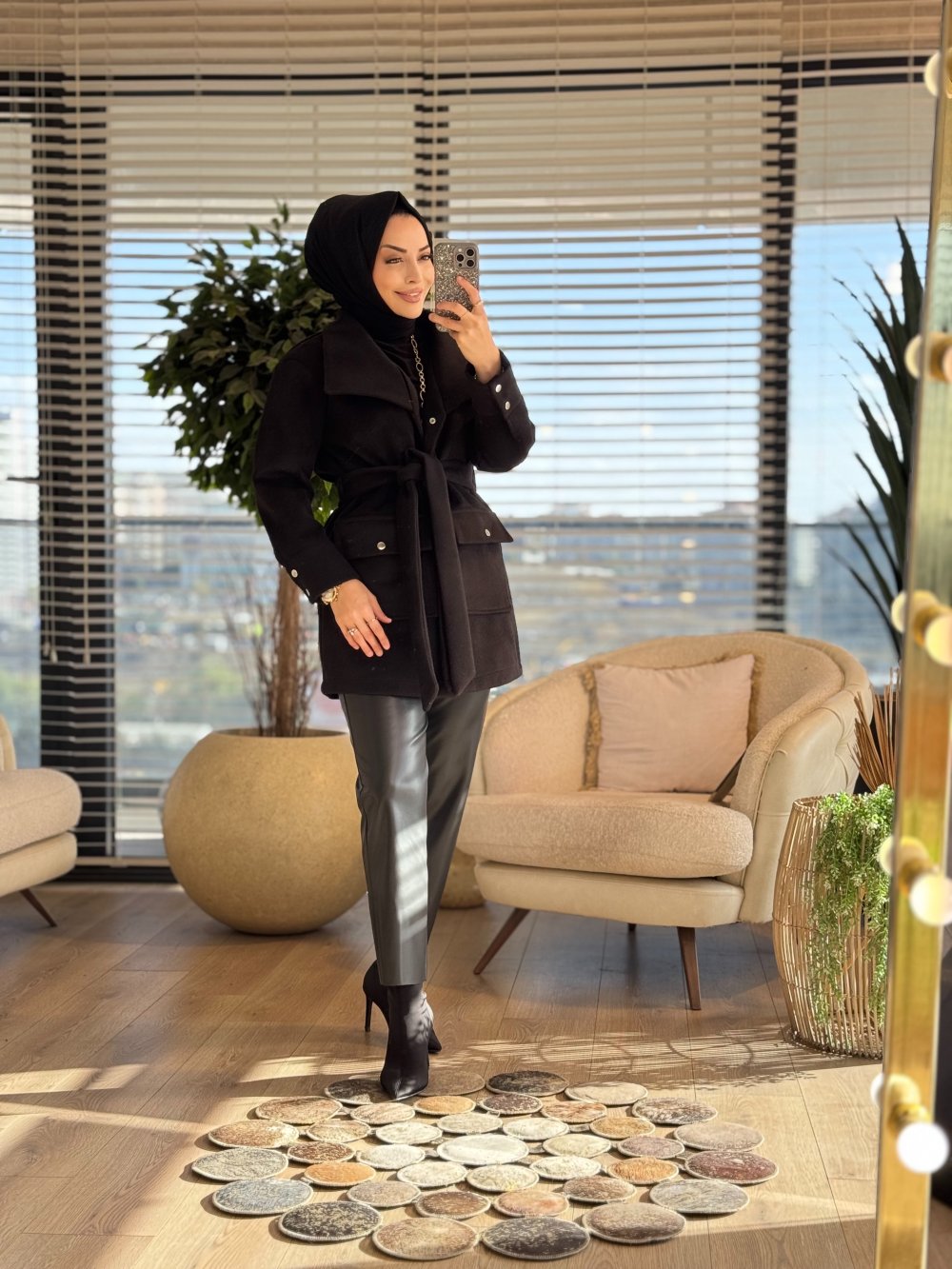 9285 Yakası Pileli Kaşe Kaban Siyah