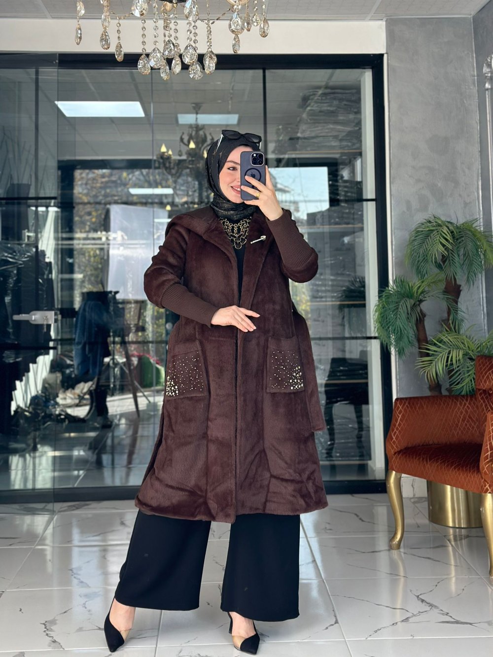 Kumaşı angora kumaştır. Kol ağızı ribanalı,Kapşonlu,kuşaklıdır