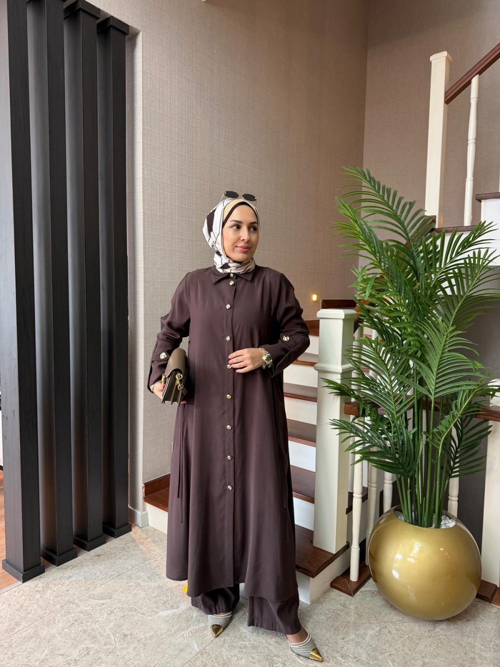 Bağlama Detay Maxi Boy Takım Kahverengi
