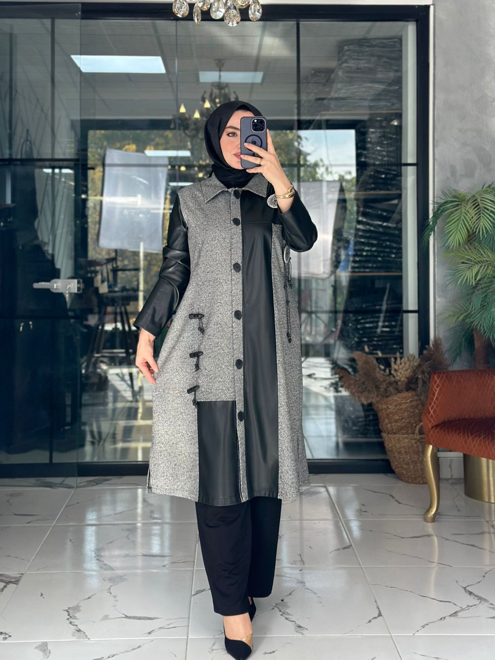Kumaşı tüvit kumaştır. Deri kombinlidir. Cebi yoktur. Önü düğmelidir.