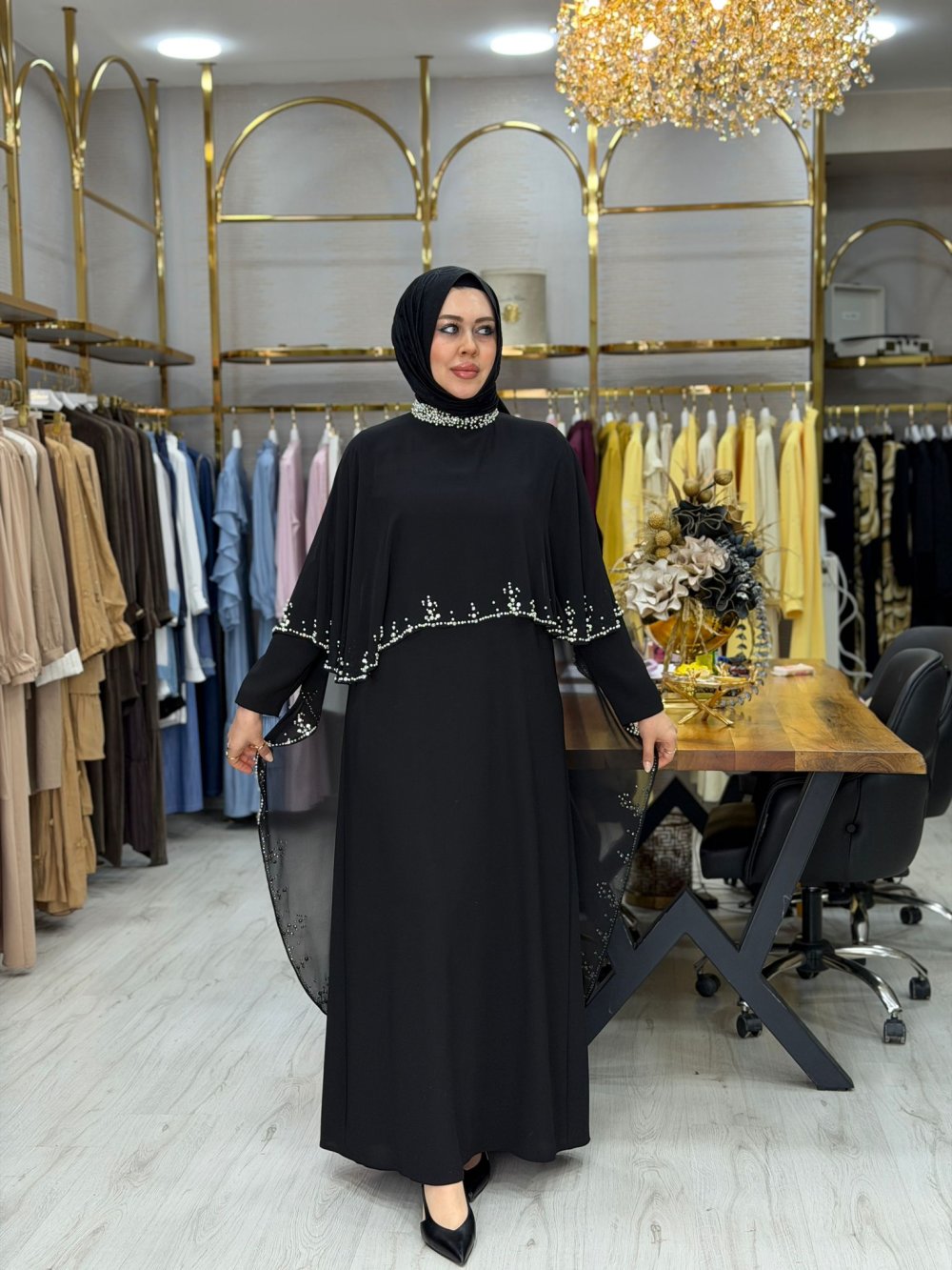 Kumaşı kreptir. Üzerindeki şifon çıkarılabilir. Taşları çakmadır.