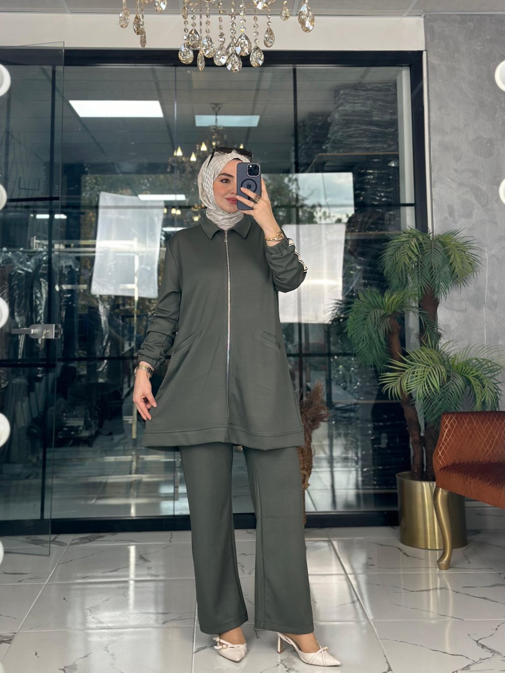 Kumaşı esnek kristal kumaştır. Pantolon beli lastiklidir. Önü hırkalıdır.