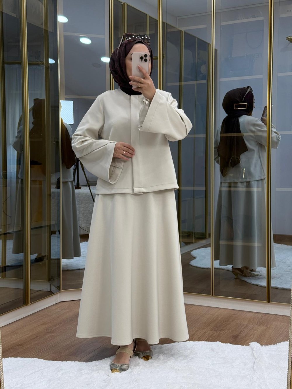 Çiçek Broş Detaylı Scuba Etekli Takım Bej