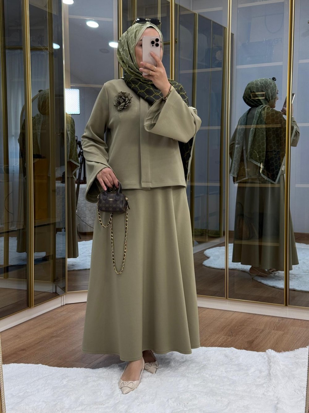 Çiçek Broş Detaylı Scuba Etekli Takım Haki