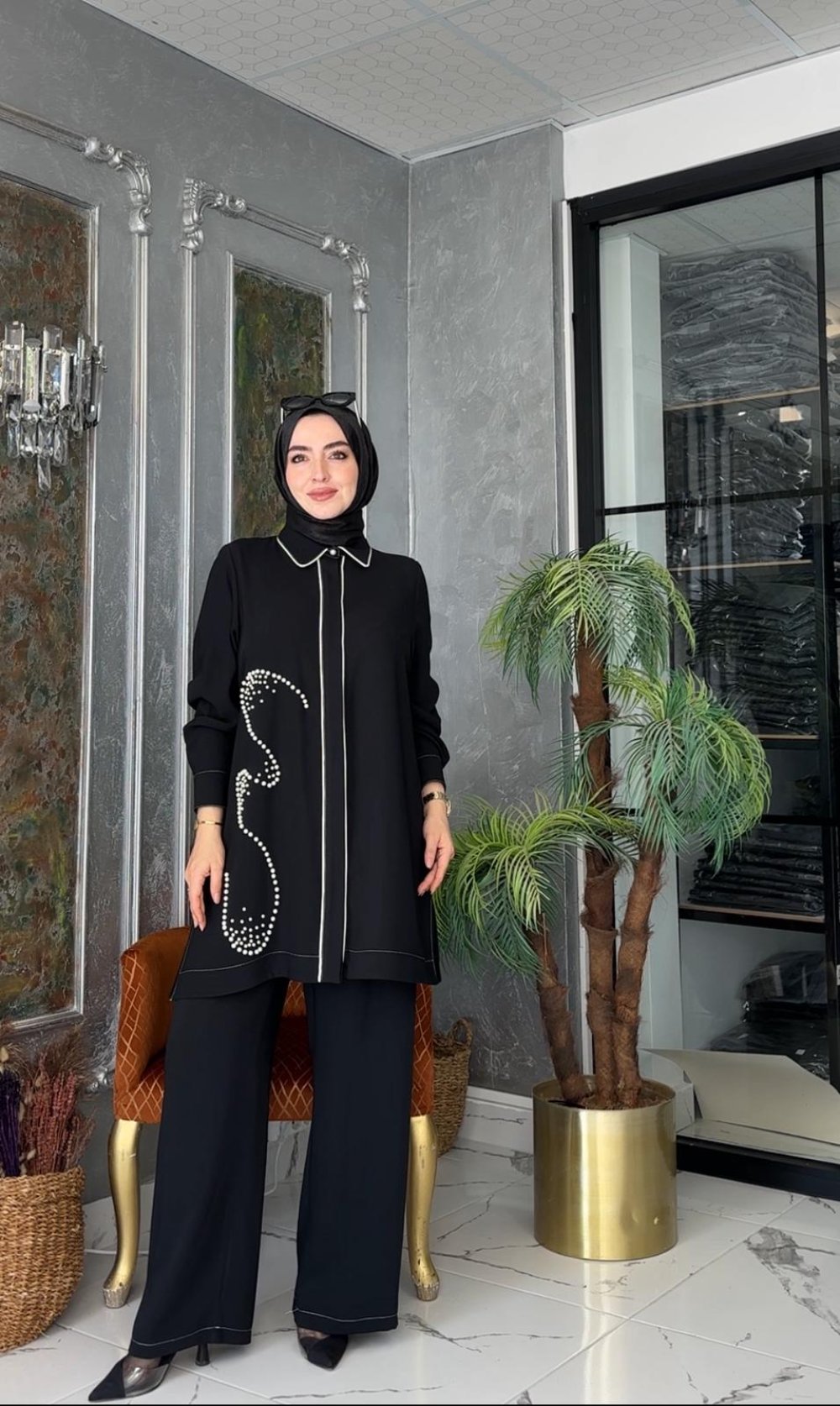 Kumaşı albino kreptir. Önü gizli kapaklı düğmelidir. Pantolon beli lastiklidir.