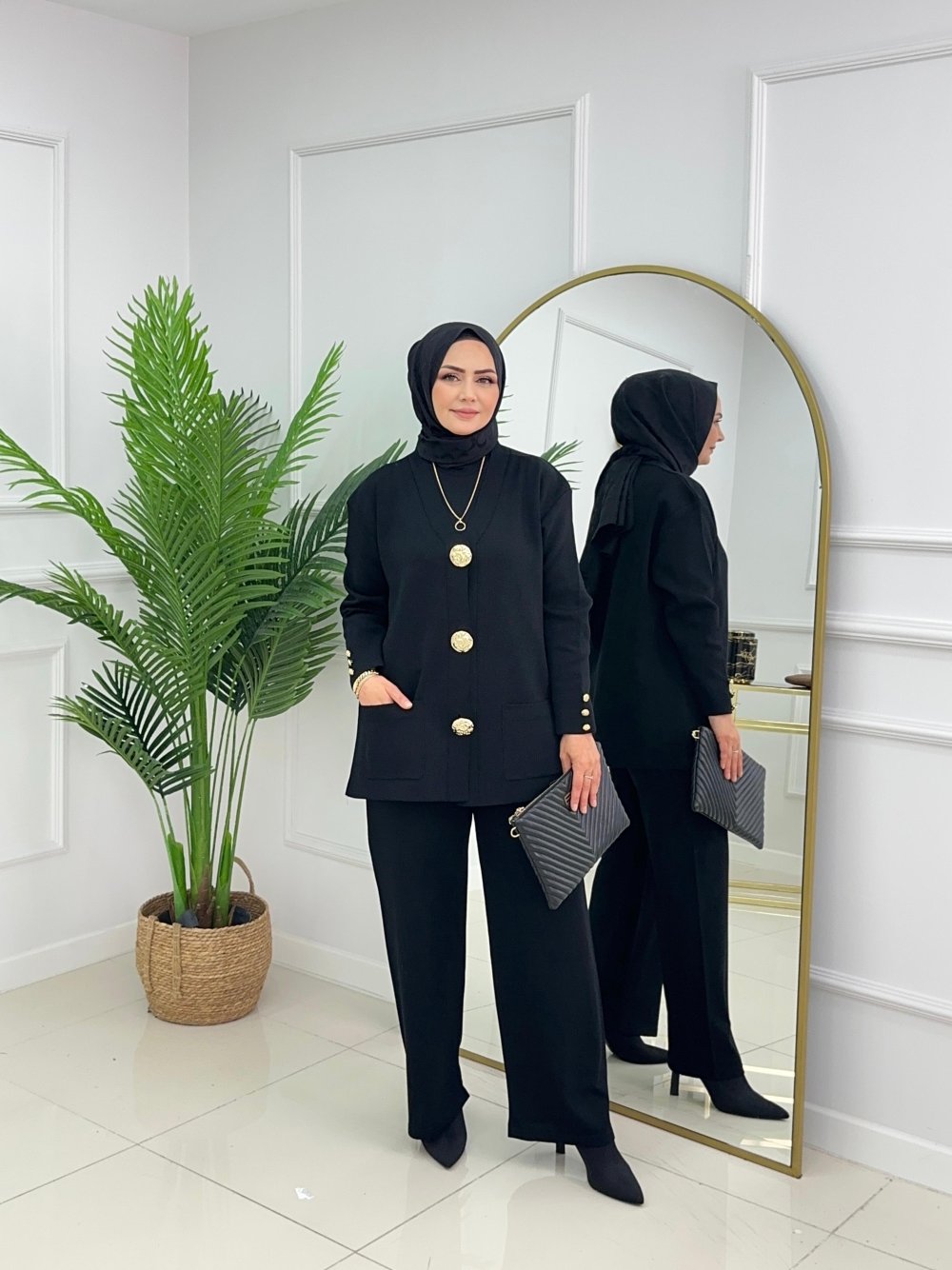 Merserize kumaşın asil duruşu, gold detayların zarafetiyle buluştu.