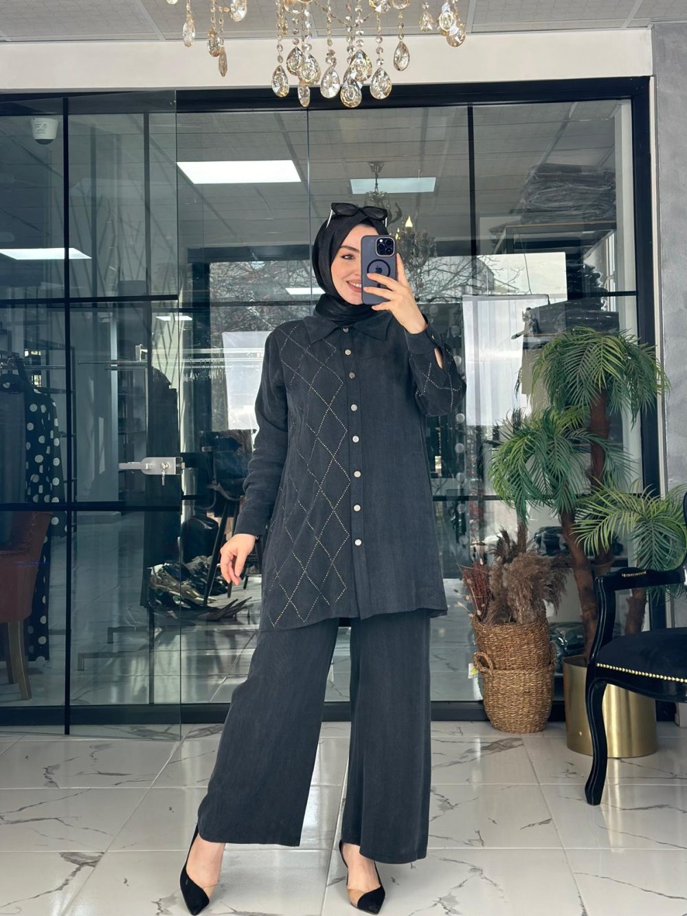 Kumaşı qupradır. Önü düğmelidir. Pantolon beli lastiklidir.