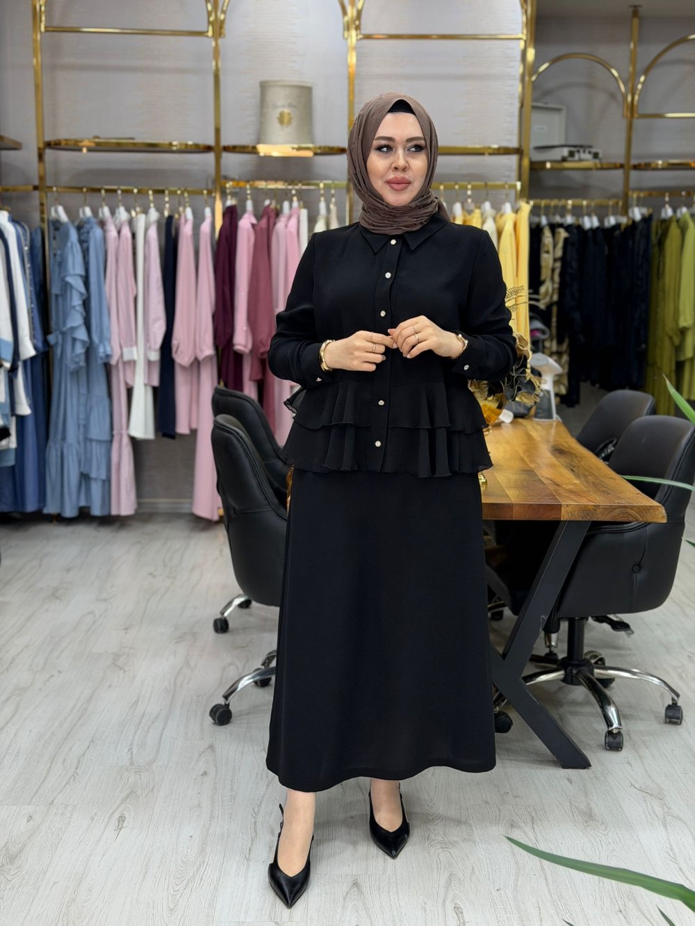 Kumaşı kreptir. Etek beli fermuarlıdır. Tuniğin önü düğmelidir.