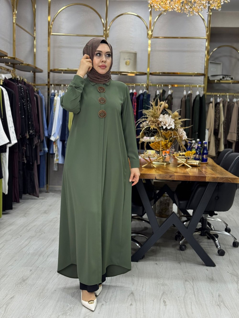 Kumaşı kreptir. Gizli düğmelidir.