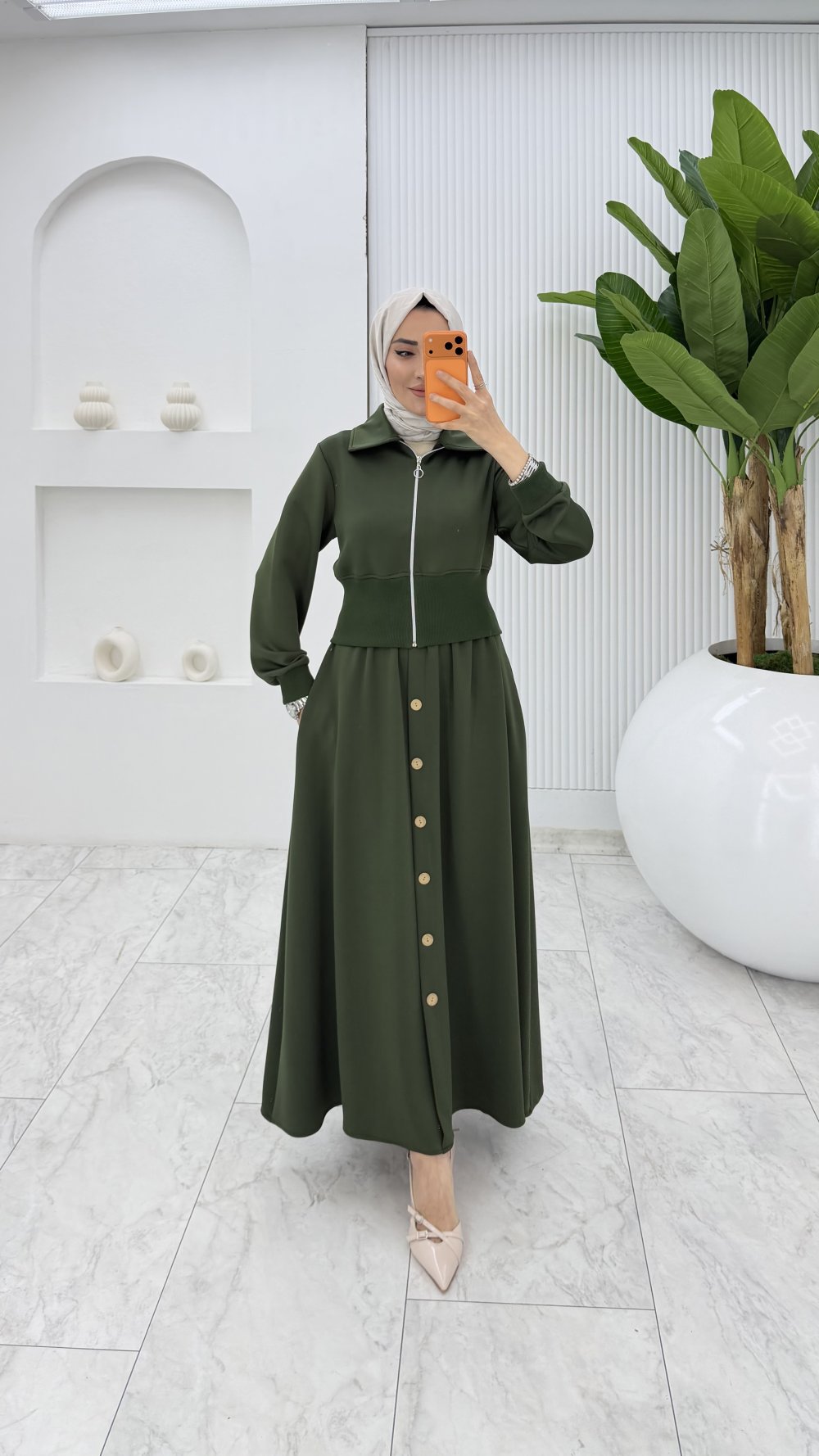 Haki Şazeli Premium Etek Takım Tesettür Giyim
