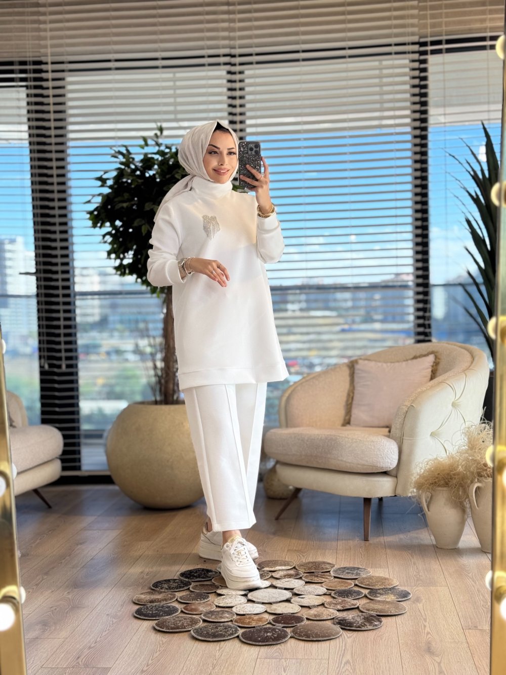 HWN9025 Kalp Broşlu Scuba Sweat Ekru