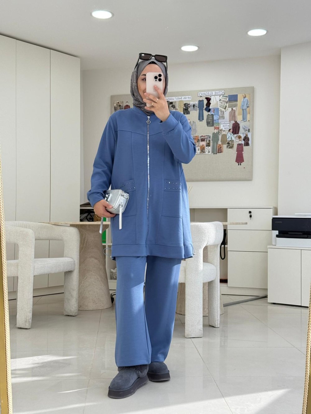 Tunik boy 85 cm’dir. Önünde metal dişli fermuarı ve yanlarda taşlı cepleri mevcuttur.