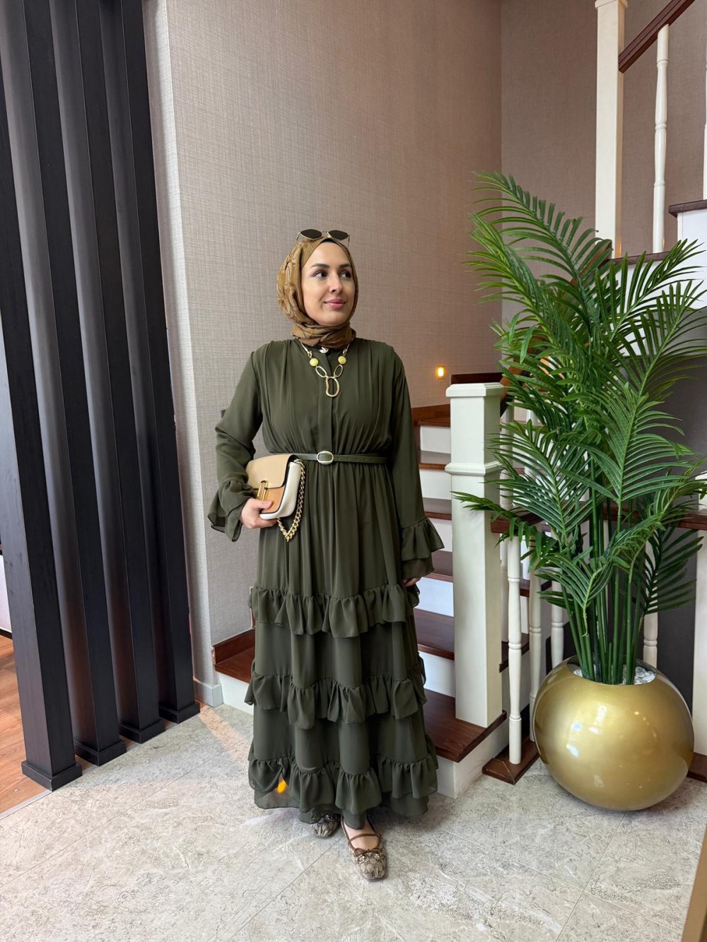 Katlı Şifon Elbise Haki