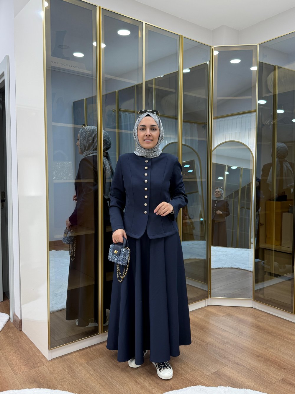 Kulp Detaylı Ceket Etekli Takım Lacivert