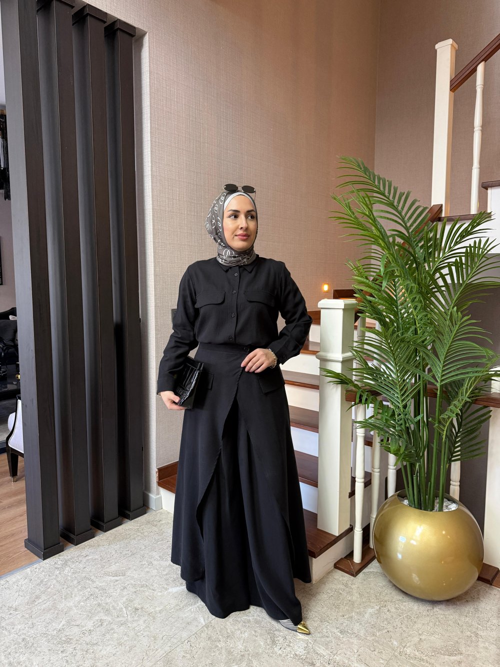 Pantolon etek formunda, boy 105 cm’dir ve beli arkadan lastiklidir.