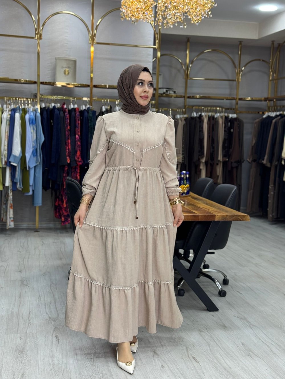 Kumaşı krinkıl kumaştır. Belden iplidir. Kol uçları lastiklidir. Önü yarım düğmelidir.