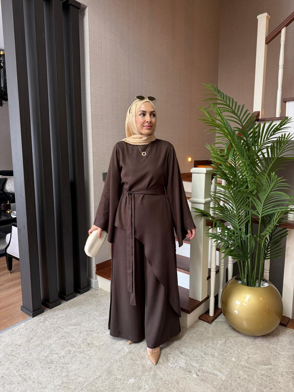 Pantolon boy 105 cm’dir. Önü kemerli, arkası lastiklidir. Pantolon etek formundadır.