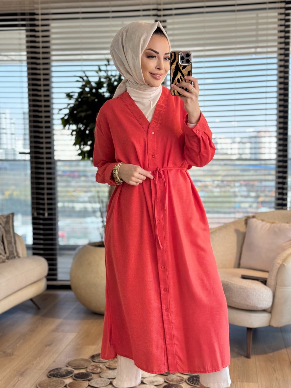 MRW1794 V Yaka Düğmeli Uzun Keten Gömlek Mercan