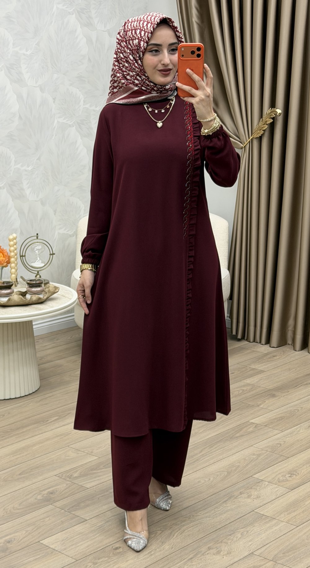 Nevin Takım,hem iş hem de günlük hayatınızda rahatlıkla tercih edebileceğiniz çok yönlü bir parçadır. Şıklığı konforla buluşturan bu tasarım, sezonun en gözde modellerinden biri olacak