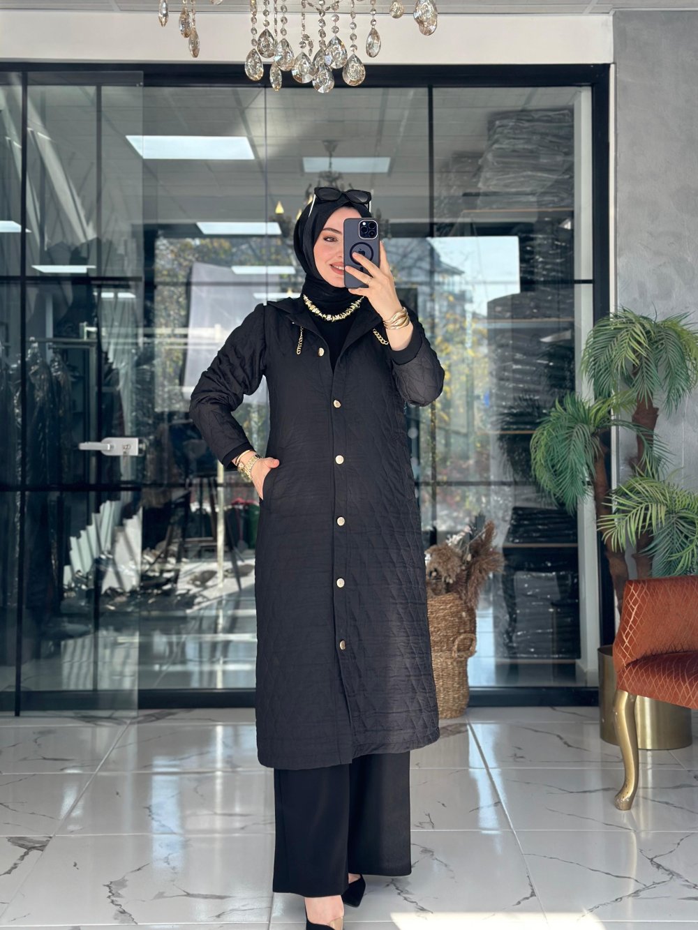 Kumaşı kapitonedir. Cepleri mevcuttur. Önü düğmelidir. Kapüşonu çıkmaz.