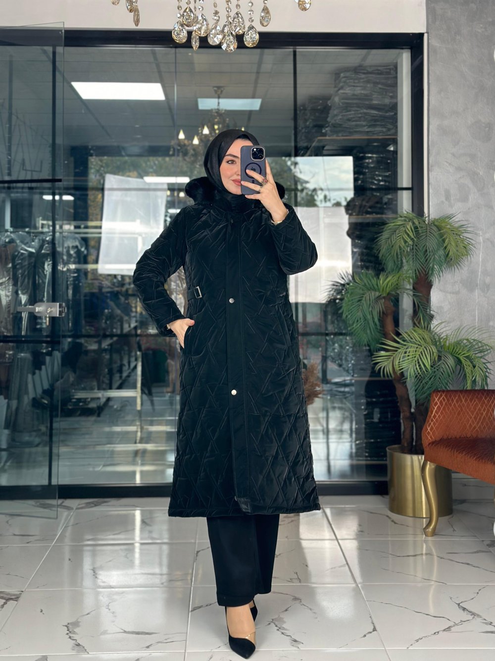 Kumaşı parlak kapitonedir. Önü gizli fermuarlıdır. Fermuarın üstündeki kapak