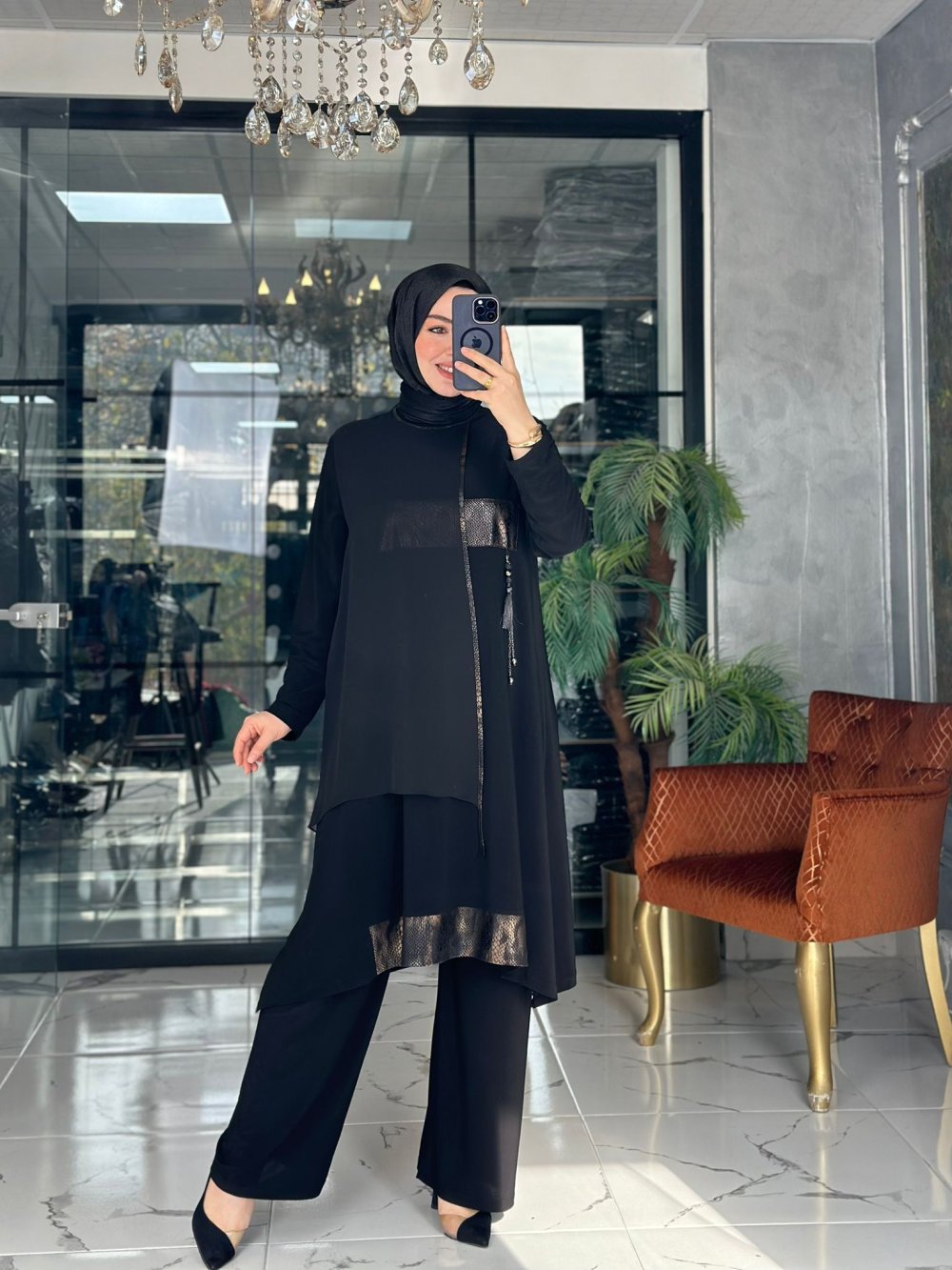 Kumaşı sandydir. Üstü şifondur. Şifonu çıkmaz sabittir. Pantolon beli
