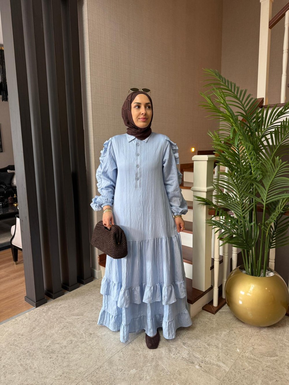 Seyyar kuşağı mevcuttur. Kollarında fırfır, etek uçlarında kat kat detayları bulunmaktadır. Kol uçları lastiklidir.