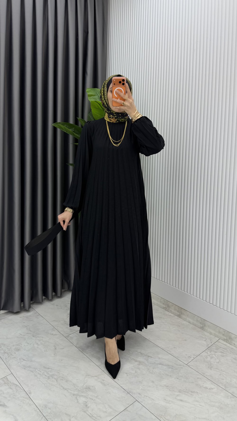 Siyah Hifa Piliseli Elbise Tesettür Giyim