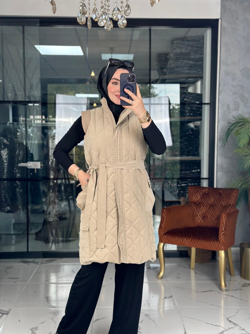 Taşlı Kapitone Yelek Vizon